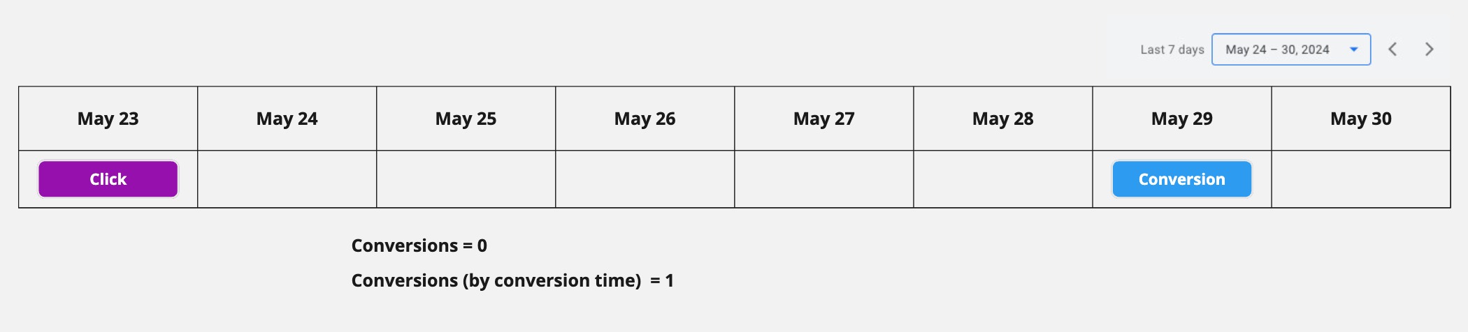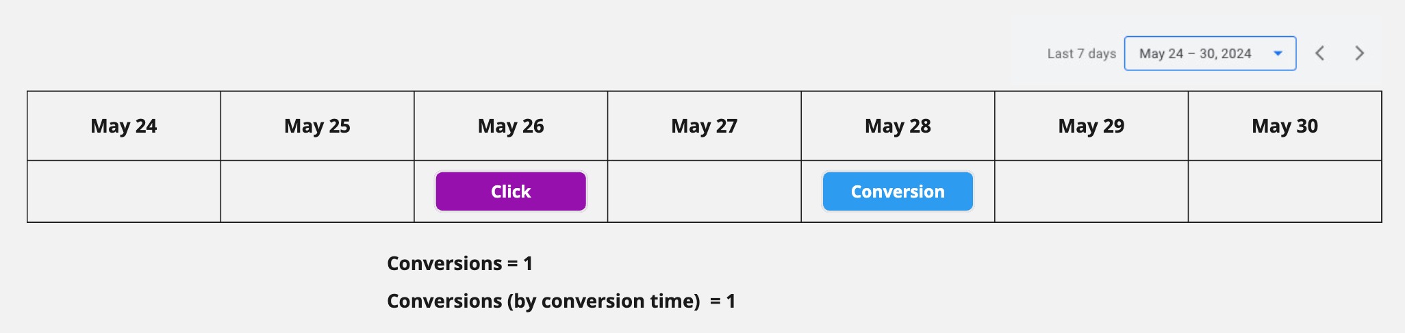 Last but not least, if the click happened on May 26th and the conversion happened on May 28th then you’ll see a conversion in both the conversion and conversion (by conv. time) column
