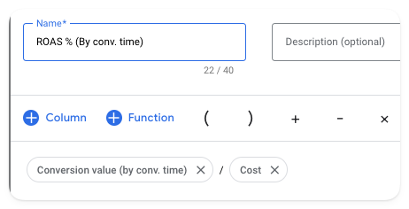 Both conversions (by conv. time) + conversion value (by conv. time) is found natively in the Google Ads columns, but the ROAS (by conv. time) is a custom metric and the formula is.