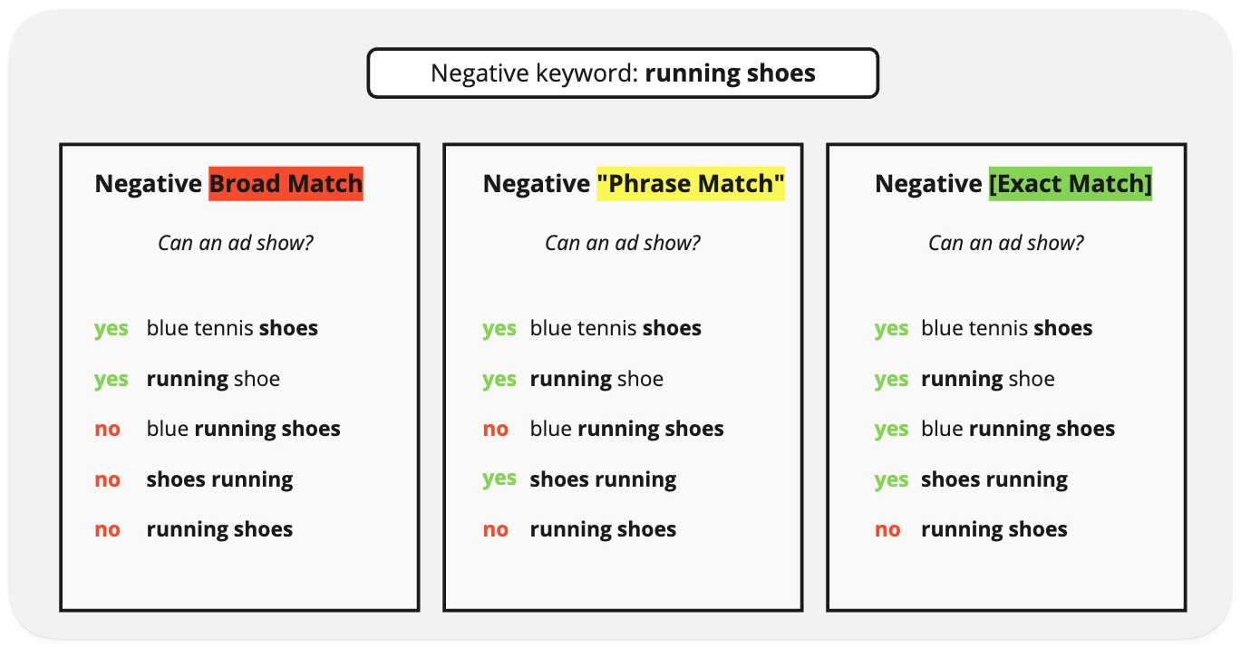 Negative keywords come with match types, just as “positive keywords”. There's broad match, phrase match, and exact match. Each type gives you a different level of control over which searches trigger your ads.