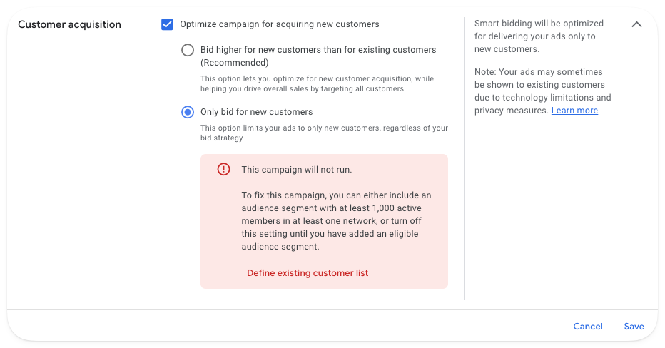When this tracking setup is finalized, you can further influence your campaign bidding model by enabling “Only bid for new customers”
